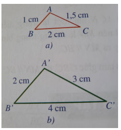 b) Nội dung: Mảnh đất trồng hoa của nhà bạn Hằng có dạng hình tam giác với độ dài các cạnh là 2 m, 3 m, 4 m. Bạn Hằng vẽ tam giác ABC có độ dài các cạnh là 1 cm, 1,5 cm, 2 cm để mô tả hình ảnh mảnh vườn đó (Hình a). Bạn Khôi nói rằng tam giác ABC nhỏ quá và vẽ tam giác A'B'C' có độ dài các cạnh là 2 cm, 3 cm, 4 cm (Hình a). Hai tam giác A'B'C' và ABC có đồng dạng hay không?