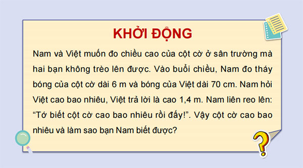 b) Nội dung: Nam và Việt muốn đo chiều cao của cột cờ ở sân trường mà hai bạn không trèo lên được. Vào buổi chiều, Nam đo thấy bóng của cột cờ dài 6 m và bóng của Việt dài 70 cm. Nam hỏi Việt cao bao nhiêu, Việt trả lời là cao 1,4 m. Nam liền reo lên: “Tớ biết cột cờ cao bao nhiêu rồi đấy!”. Vậy cột cờ cao bao nhiêu và làm sao bạn Nam biết được?