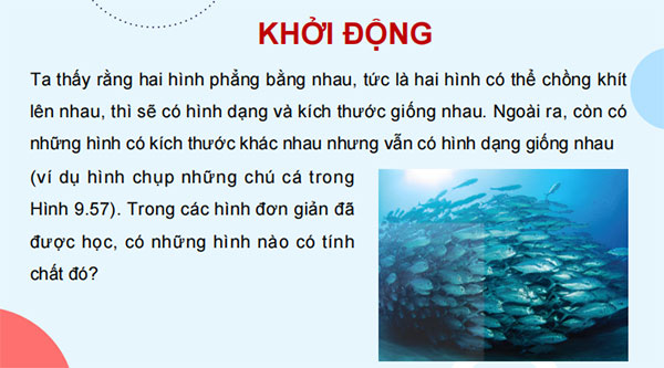 Bước 1: Chuyển giao nhiệm vụ - GV chiếu hình ảnh hoặc yêu cầu HS quan sát hình 9.57 SGK để nhận xét về hình dạng và kích thước của những chú cá. Bước 2: Thực hiện nhiệm vụ - GV yêu cầu HS quan sát, trả lời cá nhân ra nháp. - HS quan sát, tự hoàn thành yêu cầu ra nháp. Bước 3: Báo cáo, thảo luận - GV gọi HS trả lời tại chỗ. Bước 4: Kết luận, đánh giá - GV đánh giá kết quả của HS, trên cơ sở đó dẫn dắt HS vào bài học mới: Vậy trong các hình đơn giản đã được học, có những hình nào có tính chất đó? Bài học ngày hôm nay chúng ta sẽ đi tìm hiểu những hình như vậy. |