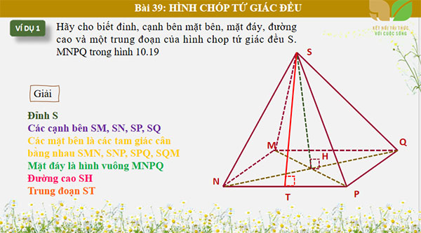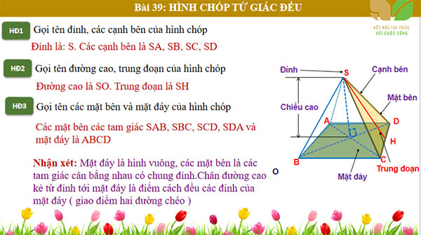 + Mô tả đỉnh, cạnh bên, mặt bên, mặt đáy, đường cao, trung đoạn của hình chóp tứ giác đều