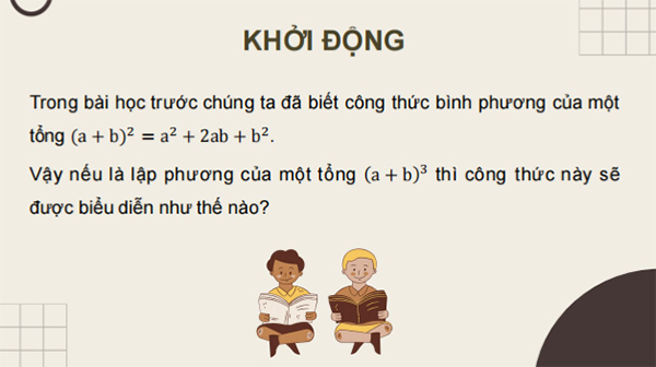 a) Mục tiêu: Gợi động cơ, dẫn đến công thức tính lập phương của một tổng