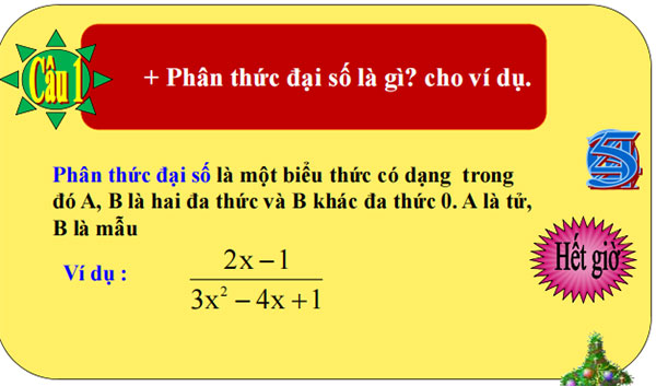Câu 1: Phân thức đại số là một biểu thức có dạng Ví dụ : Câu 2: Điều kiện xác định của phân thức Câu 3: Để tính giá trị của phân thức tại những giá trị cho trước của biến ta thay các giá trị cho trước của biến vào phân thức rồi tính giá trị của biểu thức số vừa nhận được. |