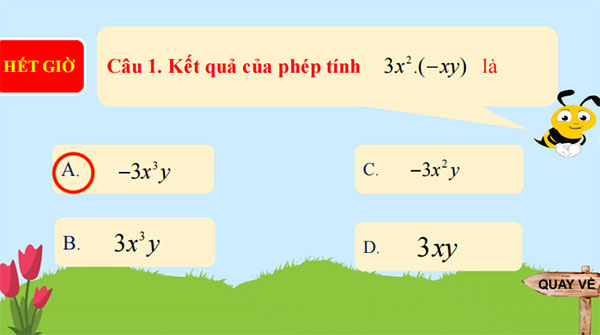 * Giao nhiệm vụ 1 - Thực hiện trò chơi: HÁI HOA TRÊN CÂY ( Gv chiếu nội dung trên màn hình) *Thực hiện nhiệm vụ - Giáo viên hướng dẫn HS: luật chơi.( Chiếu luật chơi trên màn hình powerpoin) - Trả lời các câu hỏi trong trò chơi: Câu 1. Kết quả của phép tính 3x2.(-xy) là A. -3x3y; B. 3x3y C. -3x2y ; D. 3xy Câu 2. Kết quả của phép tính - 3x2.(2x+xy-1) là