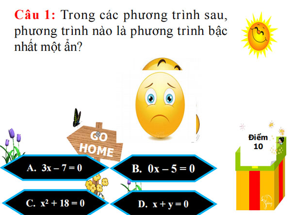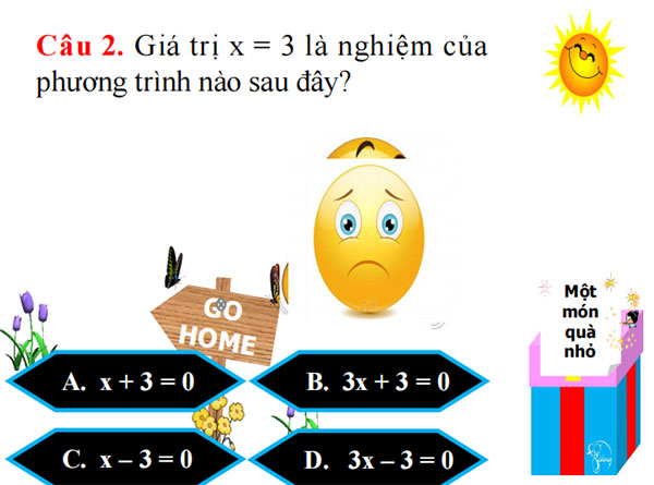 Trò chơi: Giúp ông lão câu cá * Giao nhiệm vụ - HS cả lớp quan sát các câu hỏi, đáp án của các câu hỏi và tham gia trò chơi để chọn đáp án đúng để giúp ông lão câu được cá. *Thực hiện nhiệm vụ - Giáo viên hướng dẫn HS: Luật chơi: Em hãy giúp ông lão câu cá bằng cách trả lời câu hỏi. Có 4 câu hỏi ứng với 4 lần câu, mỗi câu trả lời đúng là ta giúp ông lão câu được 1 con cá. - HS thực hiện nhiệm vụ được giao Câu 1: Đáp án: A.4x-3=0 Câu 2: Đáp án: C.2+x=0 Câu 3: Đáp án: B. Sai bước 1 Câu 4: Đáp án: D.[50x+45(x+56)].100% *Đánh giá kết quả - Khẳng định kết quả đúng. *Kết luận, nhận định: - Nhấn mạnh định nghĩa phương trình bậc nhất một ẩn và các bước giải phương trình. đưa được về dạng B1: Thực hiện các phép tính để bỏ dấu ngoặc. B2: Chuyển hết các hạng tử có chứa sang vế trái. B3: Thu gọn và giải phương trình nhận được. |