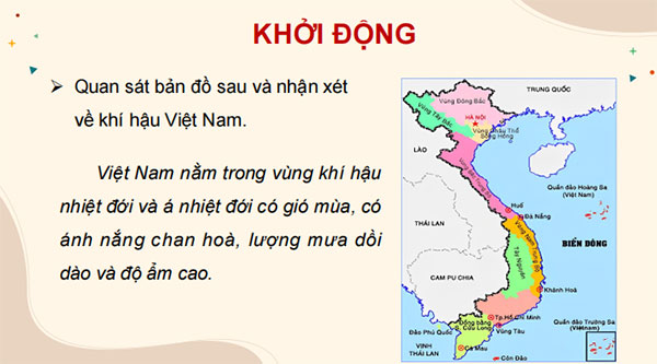 a) Mục tiêu: Thông qua hoạt động khởi động, HS biết được một số đặc điểm của khí hậu Việt Nam ; có hứng thú tìm hiểu các yếu tố minh họa cho các đặc điểm đó (nhiệt độ, lượng mưa, độ ẩm…)