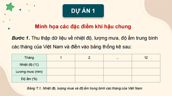 a) Mục tiêu: Hs thu thập được các dữ liệu về nhiệt độ, lượng mưa, độ ẩm trung bình các tháng của Việt Nam. Vẽ biểu đồ thích hợp biểu diễn các dãy số liệu đó. Dựa vào biểu đồ phân tích xem dữ liệu thu được minh họa cho những đặc điểm nào của khí hậu Việt Nam.