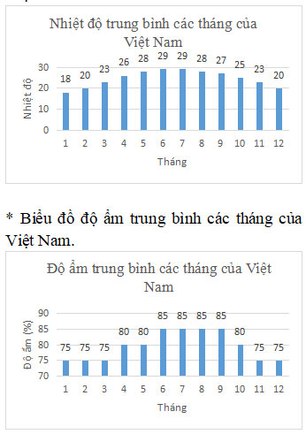 I. Minh họa các đặc điểm khí hậu chung. 1) Bảng thống kê nhiệt độ, lượng mưa, độ ẩm trung bình các tháng của Việt Nam. (Phụ lục I)