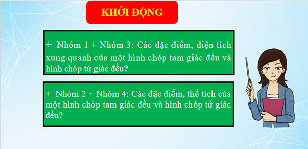 * GV giao nhiệm vụ học tập - GV chia lớp thành 4 nhóm hoạt động theo kĩ thuật khăn trải bàn và tổng hợp ý kiến vào giấy A1 thành sơ đồ tư duy theo các yêu cầu với các nội dung như sau: + Nhóm 1 + Nhóm 3: Các đặc điểm, diện tích xung quanh của một hình chóp tam giác đều và hình chóp tứ giác đều. + Nhóm 2 + Nhóm 4: Các đặc điểm, thể tích của một hình chóp tam giác đều và hình chóp tứ giác đều. * HS thực hiện nhiệm vụ: Các thành viên chú ý, thảo luận nhóm hoàn thành yêu cầu. * Báo cáo, thảo luận - HS suy nghĩ trả lời các câu hỏi của giáo viên. - HS cả lớp quan sát nhận xét câu trả lời của bạn. * Kết luận, nhận định - GV theo dõi, hướng dẫn, giúp đỡ HS thực hiện nhiệm vụ. |