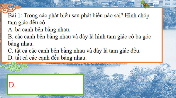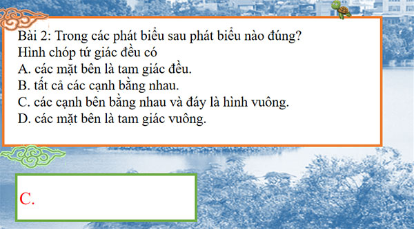 - Nhận biét được hình chóp tam giác đều, hình chóp tứ giác đều.