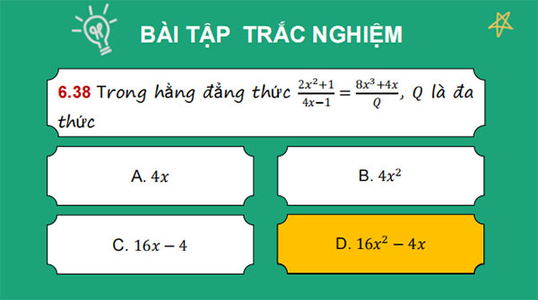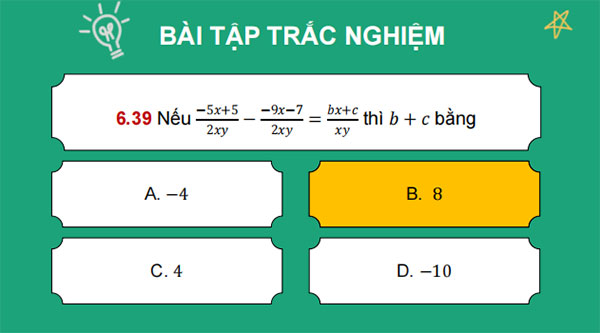 - Vận dụng được các tính chất giao hoán, kết hợp, phân phối của phép nhân đối với phép cộng, quy tắc dấu ngoặc với phân thức đại số trong tính toán.