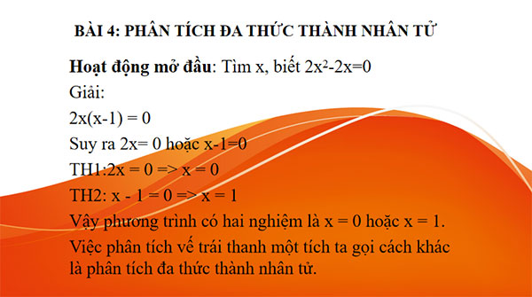 Bước 1: Giao nhiệm vụ Tìm x, biết 2x2-2x=0 Bước 2: Thực hiện nhiệm vụ - HS thực hiện nhiệm vụ được giao theo nhóm Bước 3: Học sinh báo cáo: Đại diện các nhóm báo cáo Bước 4: Kết luận, nhận định: Gv yêu cầu các nhóm nhận xét đánh giá chéo lẫn nhau Giáo viên kết luận (chuẩn hóa kiến thức) để giải bài toán trên chúng ta đã phân tích vế trái thành tích (thành nhân tử). việc phân tích này rất quan trọng. 1. Tại sao phân tích đa thức thành nhân tử quan trọng? - Giới thiệu về ý nghĩa và ứng dụng của phân tích đa thức thành nhân tử trong toán học và các lĩnh vực liên quan. - Lý giải tại sao việc phân tích đa thức thành nhân tử giúp chúng ta hiểu và làm việc với đa thức một cách dễ dàng hơn. |