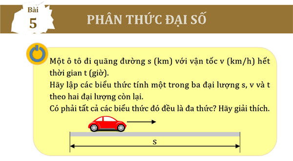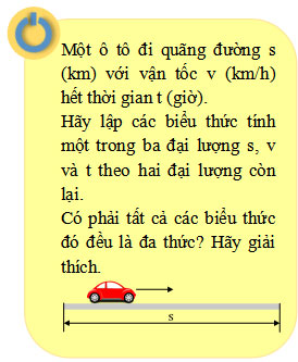 Nhiệm vụ: Giới thiệu bài i) GV giao nhiệm vụ học tập: Yêu cầu HS hoạt động cá nhân hoặc theo nhóm. ii) HS thực hiện nhiệm vụ: Trình bày và giải thích lời giải. iii) Báo cáo, thảo luận: - HS suy nghĩ trả lời các câu hỏi của giáo viên. - HS cả lớp quan sát nhận xét câu trả lời của bạn. iv) Kết luận, nhận định: - GV nhấn mạnh, ngoài các đa thức ta cần những biểu thức khác nữa để biểu thị, tính toán giá trị nhiều đại lượng quen thuộc trong thực tế. |