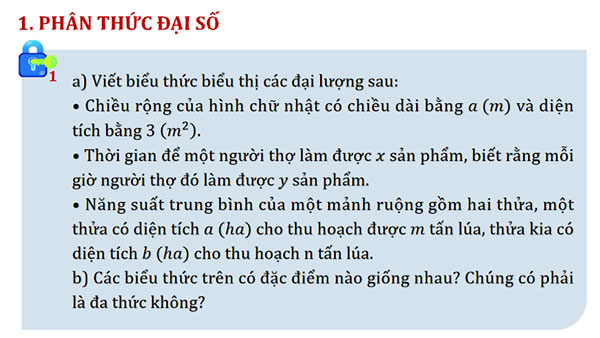 HOẠT ĐỘNG 1: HOẠT ĐỘNG MỞ ĐẦU a) Mục tiêu: Qua bài toán thực tế, HS nhận thấy cần sử dụng những biểu thức không phải là đa thức để biểu thị, tính toán giá trị của nhiều đại lượng quen thuộc. b) Nội dung: HS thực hiện các yêu cầu dưới sự hướng dẫn của GV. c) Sản phẩm: HS trả lời được câu hỏi mở đầu. Hai biểu thức d) Tổ chức thực hiện: |