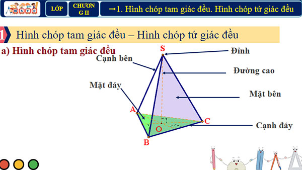 – Nhận biết được mặt đáy, mặt bên của hình chóp tam giác đều, hình chóp tứ giác đều.