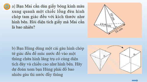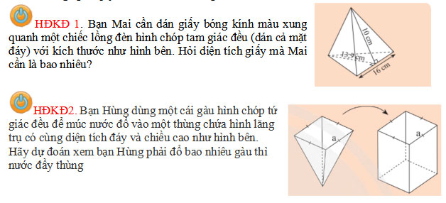 - Giải quyết được vấn đề thực tiễn gắn với việc tính diện tích xung quanh và thể tích của hình chóp tam giác đều, hình chóp tứ giác đều
