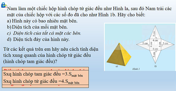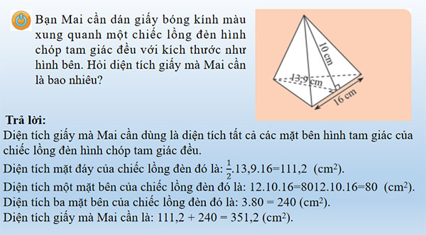 * GV giao nhiệm vụ học tập: Chiếu câu hỏi ở HĐKĐ1 * HS thực hiện nhiệm vụ: HS: suy nghĩ và trả lời * Báo cáo, thảo luận - HS trả lời câu hỏi Diện tích giấy mà Mai cần dùng là diện tích tất cả các mặt hình tam giác của chiếc lồng đèn hình chóp tam giác đều. Diện tích mặt đáy của chiếc lồng đèn đó là: 12.13,9.16=111,212.13,9.16=111,2 (cm2). Diện tích một mặt bên của chiếc lồng đèn đó là: 12.10.16=8012.10.16=80 (cm2). Diện tích ba mặt bên của chiếc lồng đèn đó là: 3.80 = 240 (cm2). Diện tích giấy mà Mai cần là: 111,2 + 240 = 351,2 (cm2). - HS cả lớp quan sát nhận xét câu trả lời của bạn. * Kết luận, nhận định - GV nhận xét và dẫn dắt vào bài mới |