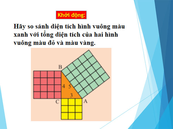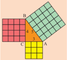 Diện tích hình vuông màu xanh: 52 = 25 Tổng diện tích hai hình vuông màu đỏ và vàng: 32 + 42 = 25 Vậy: 52 = 32 + 42 |