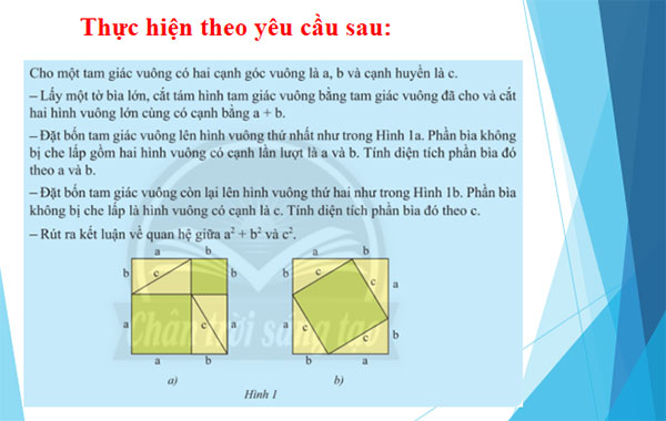 - Học sinh thực hiện nhiệm vụ theo nhóm, để hình thành mối liên hệ giữa các cạnh của tam giác vuông.