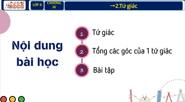 - Biết định lí tổng bốn góc của tứ giác lồi bằng ; giải thích được tính chất đó. Chú ý quy ước dùng chữ “tứ giác” thay cho chữ “tứ giác lồi”.