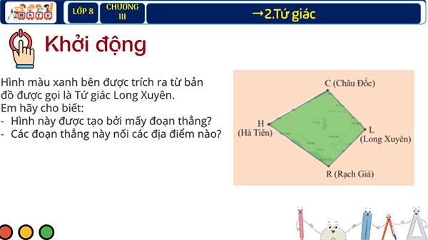 a) Mục tiêu: Giúp HS có cơ hội trải nghiệm, thảo luận về khái niệm tứ giác thông qua quan sát “Tứ giác Long Xuyên”. Giúp học sinh có hứng thú với bài học.