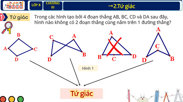 - Giúp học sinh có cơ hội trải nghiệm, thảo luận về khái niệm tứ giác, tứ giác lồi.