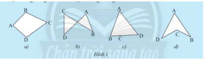 - Hình 1a, 1b, 1d không có 2 đoạn thẳng cùng nằm trên 1 đường thẳng. - Các hình trên được gọi là tứ giác - Trong tứ giác ABCD, các điểm A, B, C, D là các đỉnh; Các đoạn thẳng AB, BC, CD, DA là các cạnh. Vẽ các đường thẳng lần lượt chứa mỗi cạnh của các tứ giác sau đây và nêu nhận xét của em về vị trí của các cạnh còn lại của tứ giác đối với 2 phần mặt phẳng tạo bởi mỗi đường thẳng đã vẽ