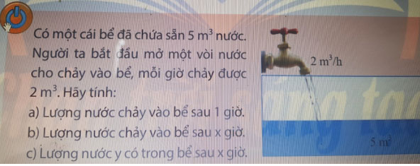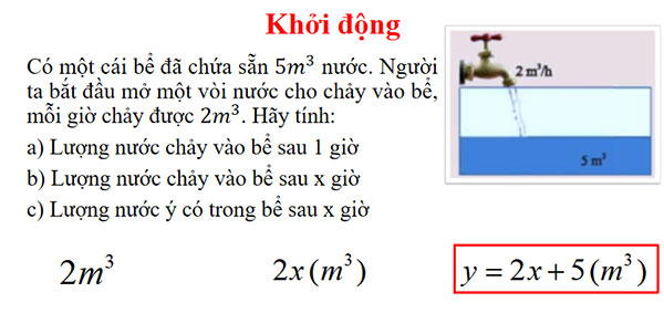 Giáo viên chuyển giao nhiệm vụ hoạt động khởi động a) 2m3 b) 2x (m3) c) y = 2x + 5 (m3) |