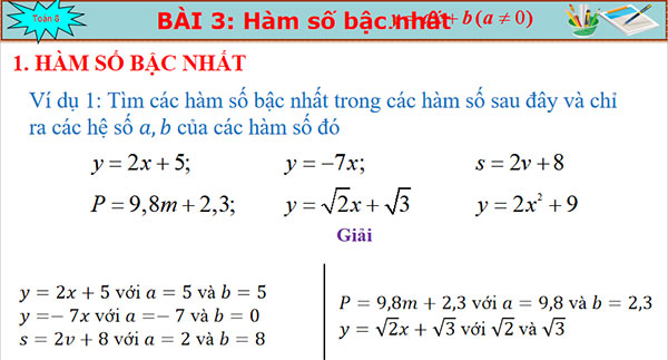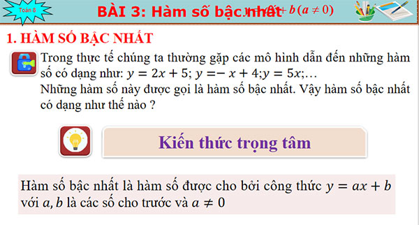 - Nhận biết được khái niệm hàm số bậc nhất.