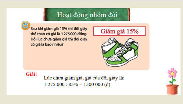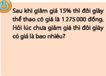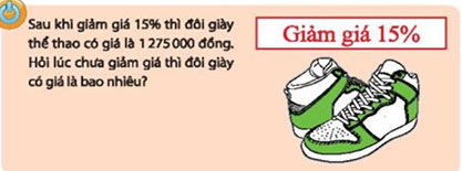 Giải: Lúc chưa giảm giá, giá của đôi giày là: 1 275 000 : 85% = 1500 000 (đ) |