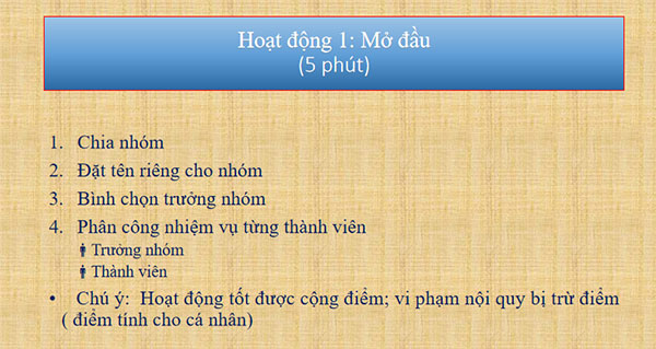 - Trình chiếu slide hđ1 - Chia lớp thành 6 -7 nhóm theo tên đã đặt. - Chọn 1 hs làm trưởng nhóm - Phân công nhiệm vụ từng nhóm và thành viên của nhóm. - Nêu nội quy buổi hoạt động |