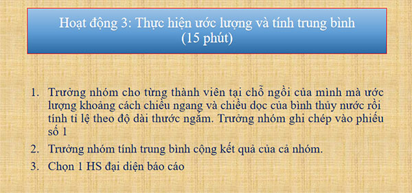 * GV giao nhiệm vụ học tập - Lớp chia thành 6 -7 nhóm và đặt tên cho từng nhóm - Bình chọn 1 hs làm trưởng nhóm - Phân công: Trưởng nhóm hoàn thành phiếu số 1; từng thành viên tự ước lượng và điền thông tin vào phiếu số 1; trưởng nhóm tính trung bình của tất cả các lần thành viên tổ đã ước lượng; trưởng nhóm cử 1hs đại diện báo cáo. * HS thực hiện nhiệm vụ - Chia tổ thành nhóm hoặc lập nhóm mới. - Từng tổ bình chọn trưởng nhóm bằng cách hình thức chỉ định hay biểu quyết. - Trưởng nhóm phân công nội dung cần thực hiện trong hoạt động. - Trưởng nhóm nhận phiếu số 1 từ giáo viên. * Báo cáo, thảo luận - HS đại diện nhóm báo cáo, cả tổ suy nghĩ trả lời các câu hỏi của giáo viên. - HS cả lớp quan sát nhận xét thảo luận câu trả lời của bạn. - GV nhận xét báo cáo của hs (nếu có) * Kết luận, nhận định GV theo dõi, hướng dẫn, giúp đỡ HS (hoặc nhóm hs) thực hiện nhiệm vụ. |