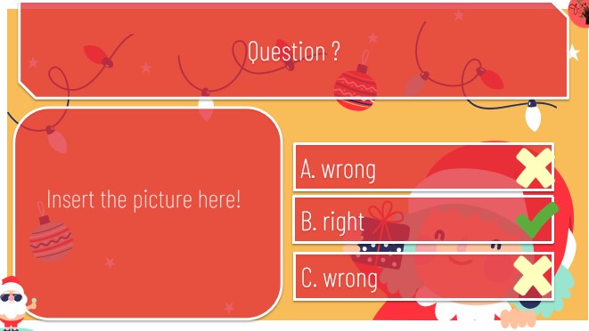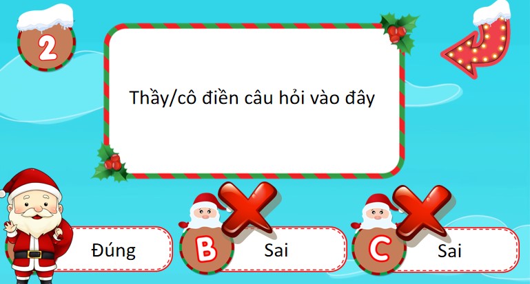 Powerpoint Trò chơi Giáng sinh gồm 4 mẫu, được thiết kế dưới dạng file PPT với bộ câu hỏi trắc nghiệm đố vui Giáng Sinh và ông già Noel. Các thầy cô giáo có thể dễ dàng chỉnh sửa nội dung của file Game PPT Giáng Sinh bằng cách nhập nội dung câu hỏi và câu trả lời theo dạng trắc nghiệm.