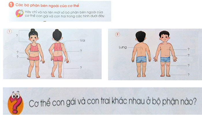 • Hình vẽ cơ thể con trai và con gái với đầy đủ các bộ phận bên ngoài của cơ thể (bao gồm cả cơ quan sinh dục ngoài của con trai và con gái).