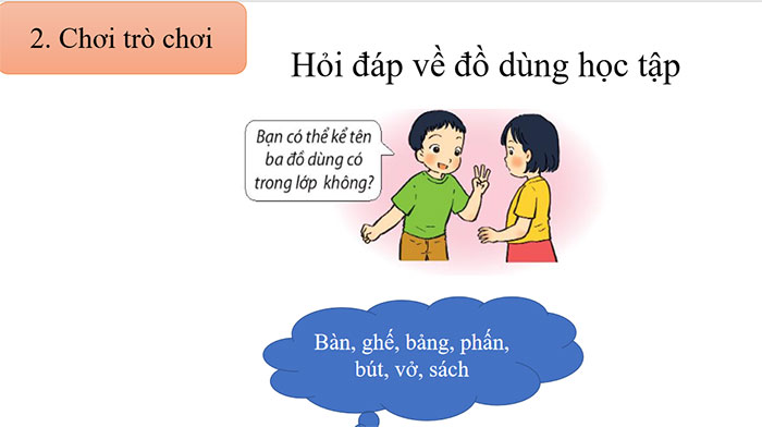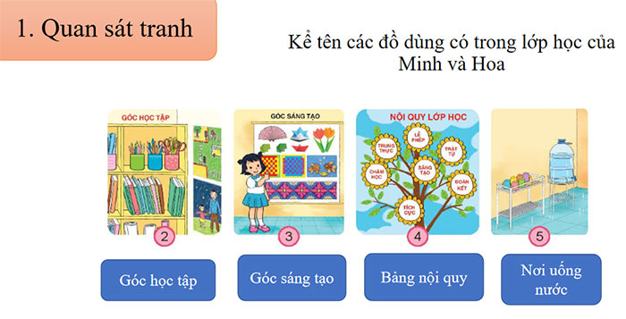 • Nói được tên một số đồ dùng, thiết bị có trong lớp học và công dụng của các loại đồ dùng đó.