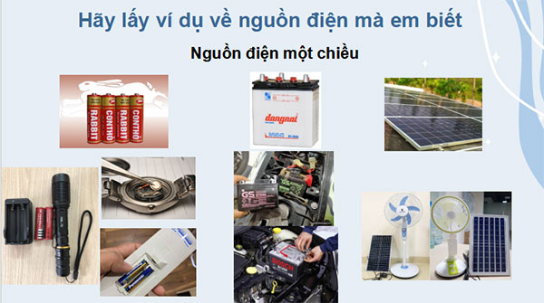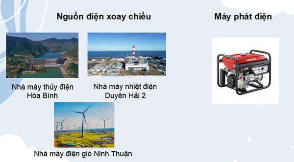 - HS trả lời câu hỏi mở đầu: Theo như quan sát, ta thấy: - Nguồn điện một chiều: Pin, Ắc quy, Pin Mặt Trời. Ví dụ: Pin thì dùng trong đèn pin. Đồng hồ đeo tay, đồng hồ bàn. Còn Ắc quy thì dùng trong xe ô tô, xe máy vv… - Nguồn điện xoay chiều: Nhà máy thủy điện hòa bình. - Máy nổ. |