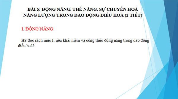 - GV dẫn dắt HS vào bài: “Như các em đã trả lời ở trên, Trong dao động điều hòa cũng có sự chuyển đổi giữa động năng và thế năng vì có sự thay đổi về vận tốc đồng thời cũng có sự thay đổi về li độ trong quá trình dao động. Chúng ta sẽ đi vào bài mới: “ Bài 5: Động năng. Thế năng. Sự chuyển hoá năng lượng trong dao động điều hoà.