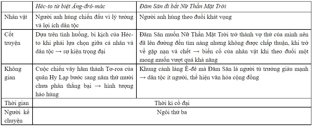 Lập bảng tổng hợp những đặc trưng của sử thi được thể hiện trong hai đoạn trích Héc-to từ biệt Ăng-đrô-mác và Đăm Săn đi bắt Nữ Thần Mặt Trời trên các phương diện: nhân vật, cốt truyện, không gian, thời gian, người kể chuyện.