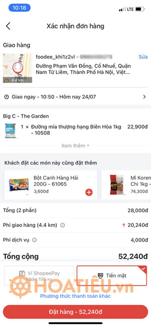 Bước 7: Sau khi đã có thông tin người nhận, các bạn nhấn Đặt ngay để tiến hành giao hàng. Về phương thức thanh toán thì các bạn có thể lựa chọn hình thức trả tiền qua Zalo pay hoặc bằng tiền mặt đều được.