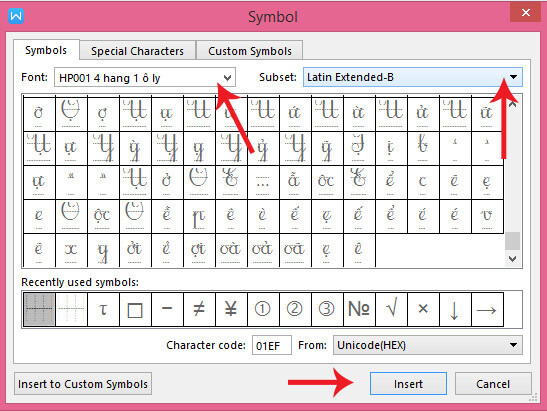 Bước 2: Tiếp theo nhấn Insert > Symbol > More Symbol. Khi xuất hiện hộp thoại Symbol, ở mục Font chọn HP001 4 hàng 1 ô ly, mục Subset chọn Latin Extended-B. Sau đó, nhấn Insert để thêm các mẫu ô ly vào văn bản.