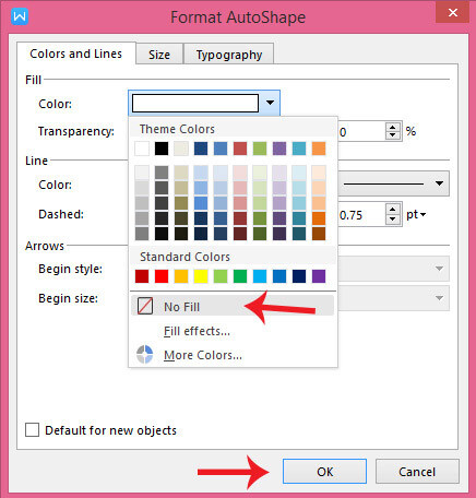 Bước 7: Kích chuột phải, chọn Format Auto Shape. Tiếp theo, chọn No fill để hiển thị các ô ly bị đề bên dưới shape vừa chèn, nếu không để No fill sẽ không nhìn thấy ô ly.