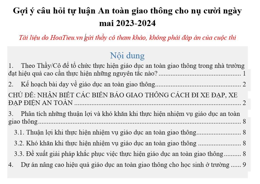 Chi tiết gợi ý đáp án câu hỏi tự luận An toàn giao thông cho nụ cười ngày mai giáo viên 2023 mời các bạn xem trong file tải về.