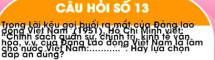 Câu 30. Trong Lời tuyên bố với quốc dân sau khi đi Pháp về (10/1946), Hồ Chí Minh khẳng định: