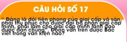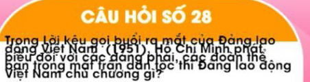Câu 27. Trong bản Chương trình tóm tắt của Đảng (in trong Văn kiện Đảng 1929-1935), Hồ Chí Minh viết: “Đảng là … của đạo quân vô sản gồm một số lớn của giai cấp công nhân và làm cho họ có đủ năng lực lãnh đạo quần chúng”. Hãy chọn đáp án đúng