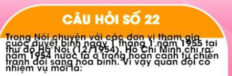 Câu 22. Trong Nói chuyện tại Hội nghị cán bộ ngoại giao lần thứ 5 (16/3/1966), Hồ Chí Minh nói: “Cần phải giải thích cho được là, trước ta đã đánh thắng được Pháp vì …”. Hãy lựa chọn đáp án đúng?