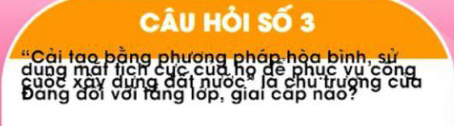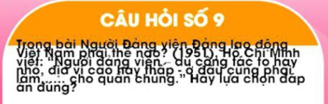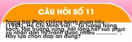 Câu 10: Lựa chọn cụm từ thích hợp điền vào chỗ trống: Trong Bài nói tại hội nghị cán bộ cao cấp nghiên cứu Nghị quyêt Hội nghị lần thứ 12 Ban chấp hành Trung ương Đảng (16/1/1966), Hồ Chí Minh nói: “Phải giải thích làm sao cho mọi người đều…, tự nguyện, tự giác làm, không ép buộc…”.