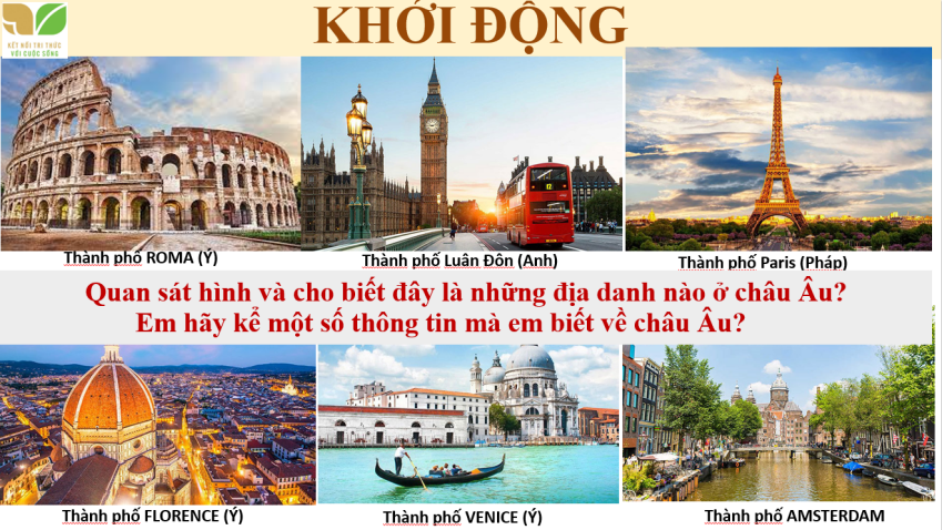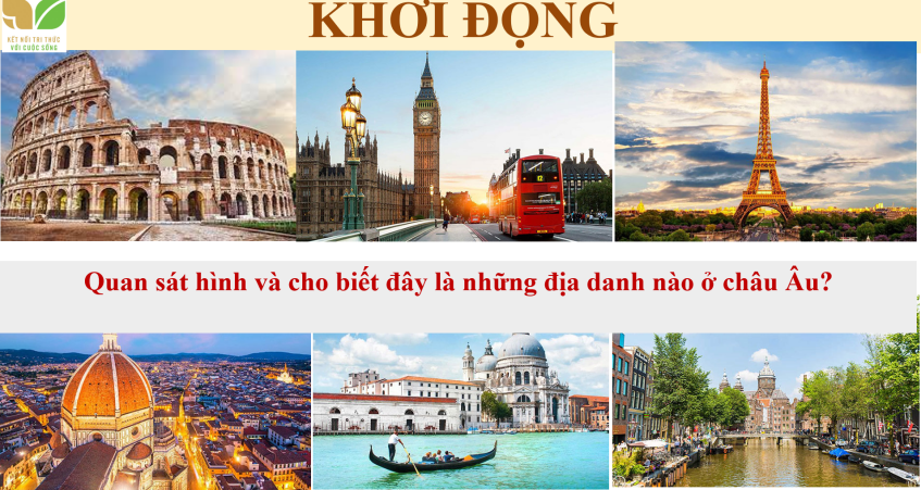 1. Hoạt động 1: Mở đầu - 5 phút a) Mục tiêu: - Hình thành được tình huống có vấn đề để kết nối vào bài học. - Tạo hứng thú cho HS trước khi vào bài mới. Giúp GV biết được những thông tin HS đã có về thiên nhiên châu Âu, để có thể liên hệ và lưu ý khi dạy bài mới. b) Nội dung: Học sinh quan sát các hình và dựa vào hiểu biết của mình để trả lời câu hỏi. - Đây là những địa danh của quốc gia nào ở Châu Âu? - Em hãy kể một số thông tin mà em biết về châu Âu.