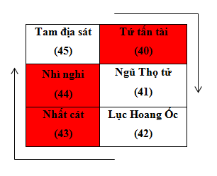 Ví dụ: Tính xem tuổi 45 có phạm phải hạn hay không? Lấy tuổi 40 tương ứng với Tứ Tấn Tài, theo chiều kim đồng hồ thì 41 là ngũ Thọ Tử, 42 là Lục Hoang Ốc, 43 là Nhất Cát, 44 là Nhì Nghi, và 45 là Tam Địa Sát. Vậy tuổi 45 phạm phải cung Tam Địa Sát xấu, cần tránh việc xây nhà vào năm tuổi này.