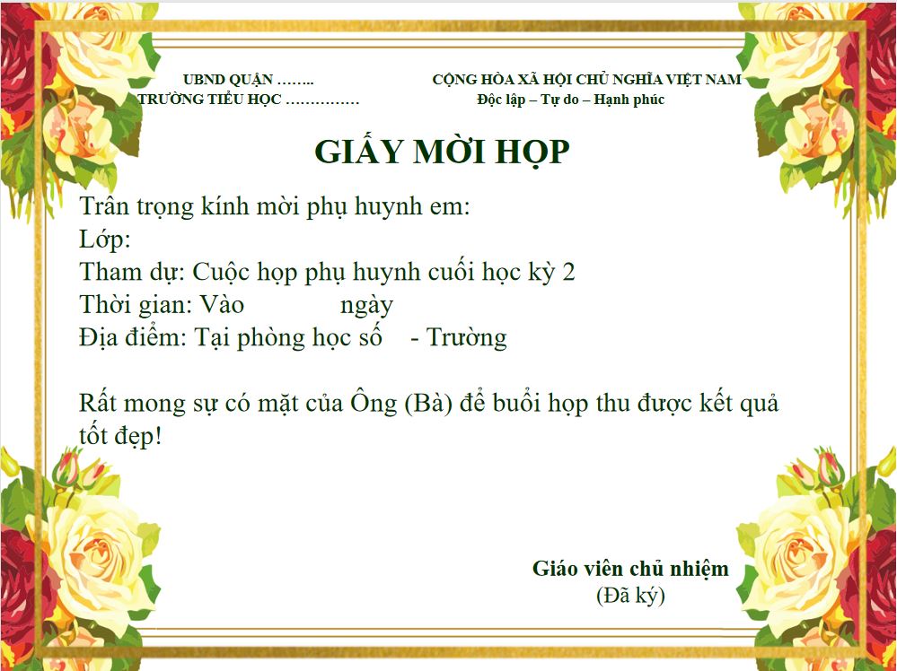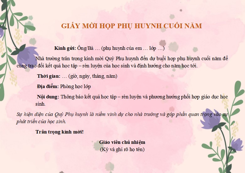Mẫu giấy mời họp phụ huynh 2025