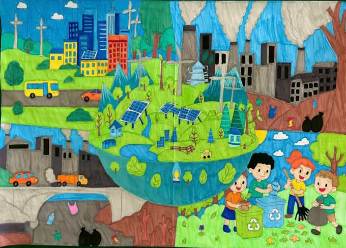 Thông điệp: Giữa hai thế giới đối lập – một bên ô nhiễm, một bên xanh trong – ngôi nhà như một “trái tim xanh” lan tỏa sự sống và hy vọng. Ánh sáng năng lượng sạch không chỉ thắp sáng không gian mà còn soi đường cho con người lựa chọn tương lai bền vững. Mỗi hành động nhỏ hôm nay chính là nhịp đập góp phần giữ cho trái tim ấy luôn khỏe mạnh. Hãy cùng chung tay bảo vệ môi trường để thế giới xanh không còn là ước mơ, mà trở thành hiện thực.