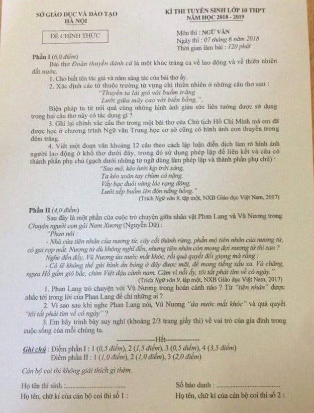 Đề thi vào 10 môn Ngữ văn Hà Nội 2018